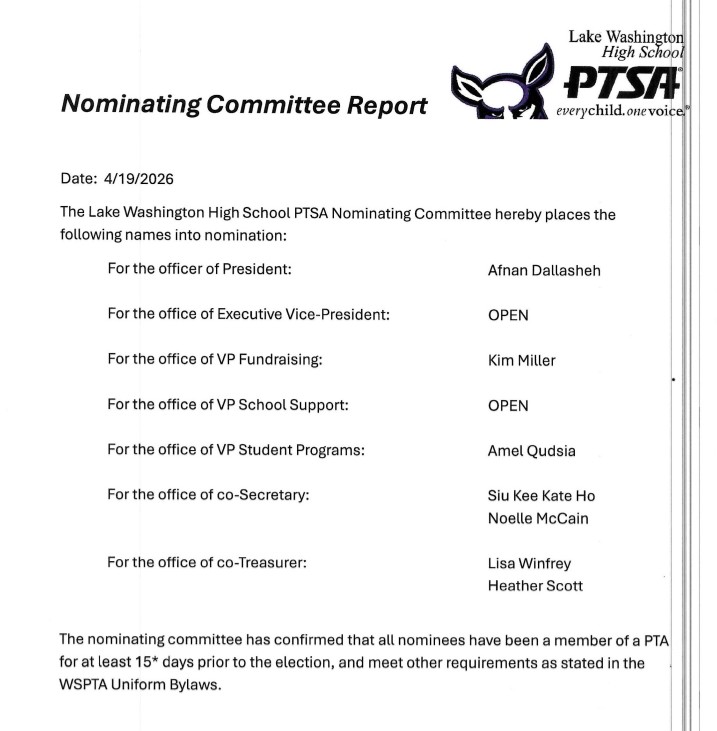 Volunteer, noun: A person who freely offers their time, talent, and energy to support others. Time is one of our most valuable resources, it can’t be replaced or recreated, only given. When someone chooses to give their time, it makes a lasting impact on our school community. As you reflect on this year at Lake Washington High School, consider those who have gone above and beyond. We invite you to nominate individuals for one of four awards: Golden Acorn, Outstanding Educator, Outstanding Advocate, and Outstanding Student Advocate. Please take a moment to recognize someone who has made a difference. Awards will be presented on June 3, 2026, in the LWHS Commons during our annual Volunteer Tea. All are welcome to attend and celebrate these incredible contributions. Click here to nominate an exceptional member of our community! Best, Kim Miller GO KANGS! |